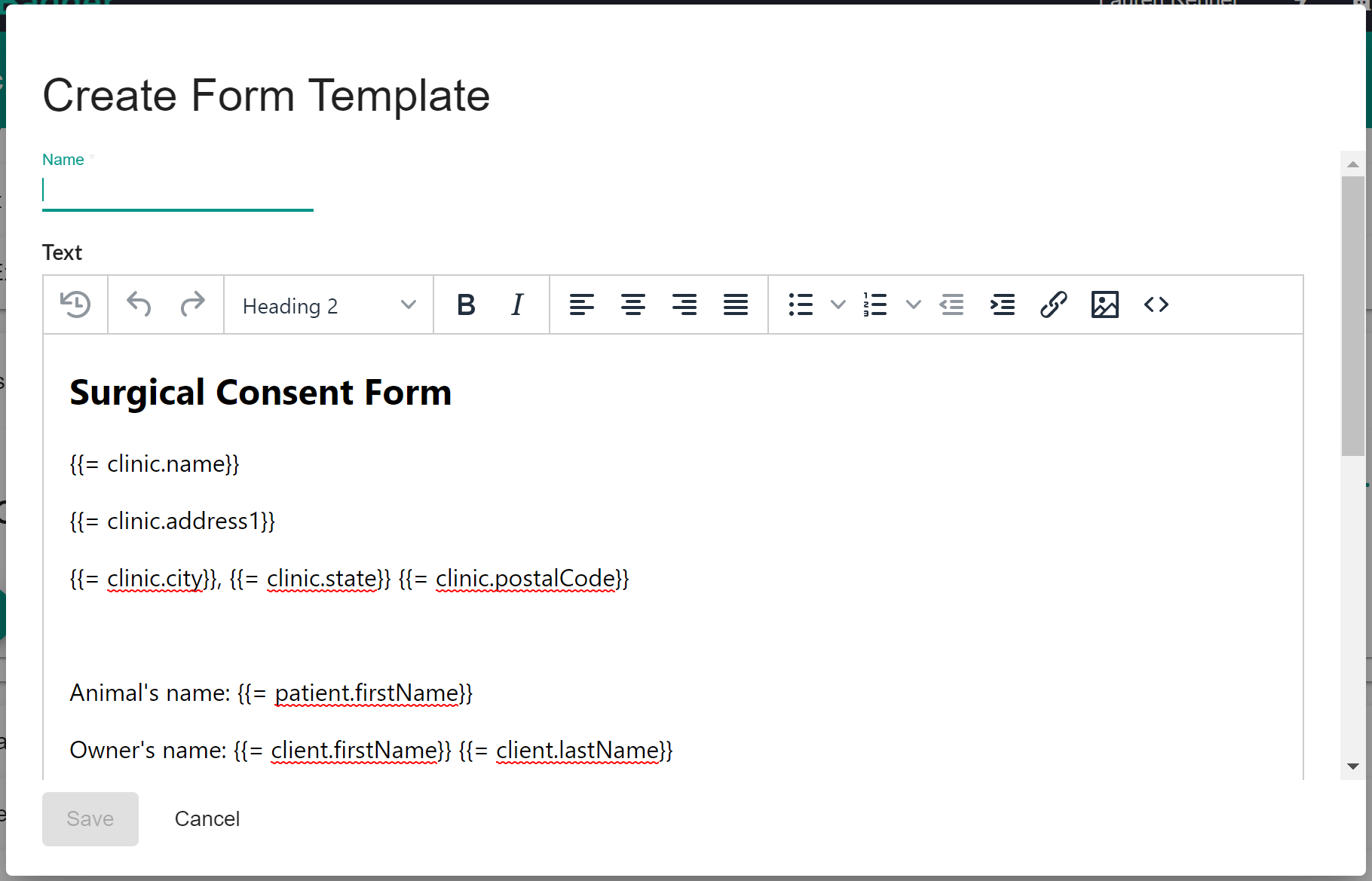After that select the plus button to start the create form process. This opens the form editor for a new form. It will populate the form section with a stock surgical consent form to give you something to work with. Importantly it shows how to use the placeholders available to you in the form. Things like {{= patient.firstName }} which will render the Patient's first name when the form is produced in the context of a patient.