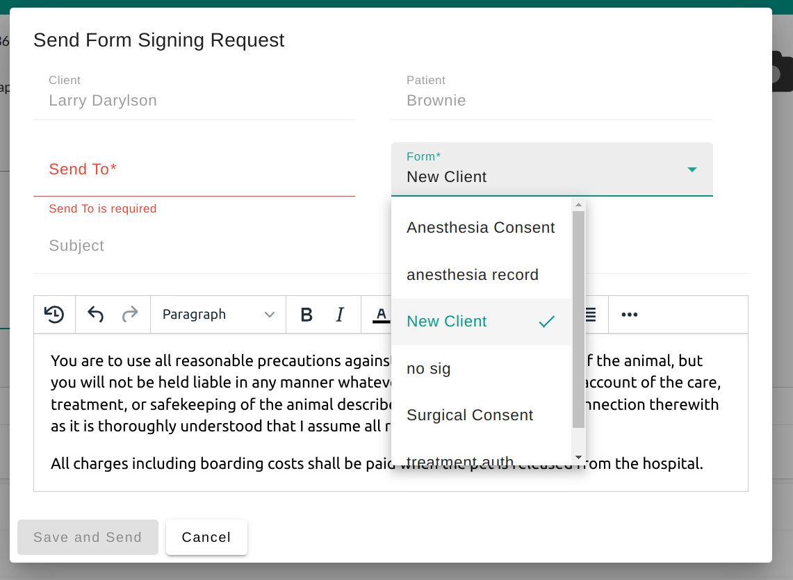Once you've created a form, you can send it to your client by using the "Request Form Completion" option from the Patient Dashboard: